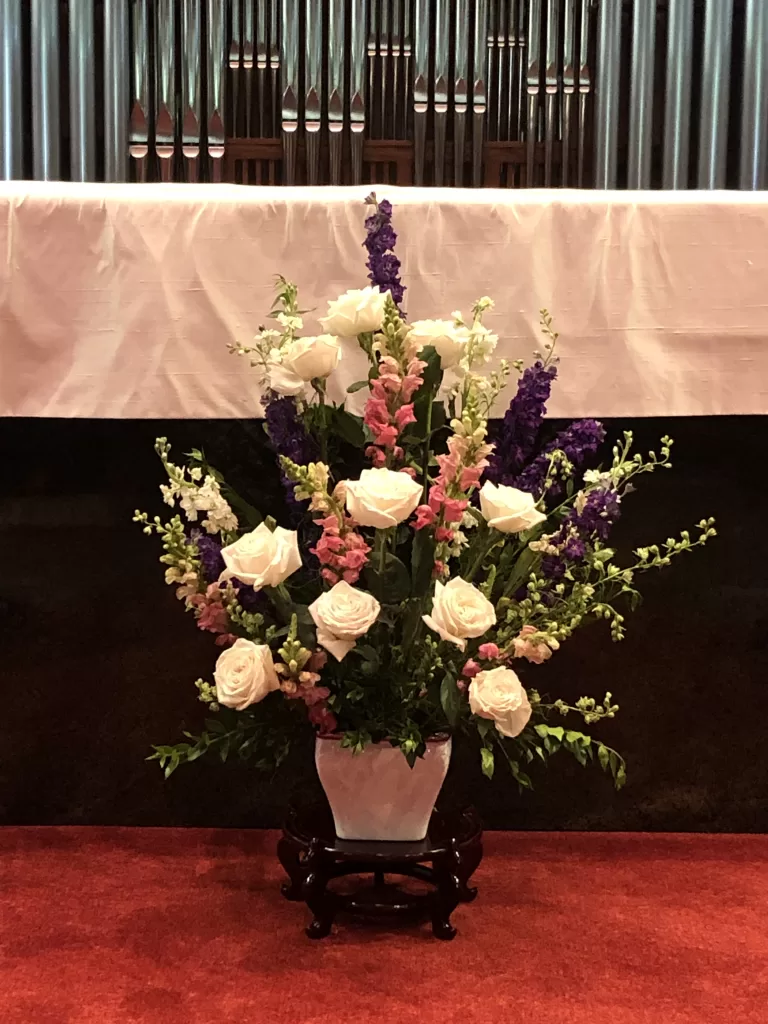 You’ve probably noticed that the style of our altar flowers varies from week to week depending on the arranger. Some flower guild members create classical arrangements while others tend toward informality. Some design floral displays and order specific flowers in advance to fit their vision. Others make spontaneous choices based on what they find in grocery store floral departments, at the Farmer’s Market, or blooming in parishioners’ gardens, along roadsides, or on the church grounds. Regardless, we all get to play with flowers and explore our creative side.